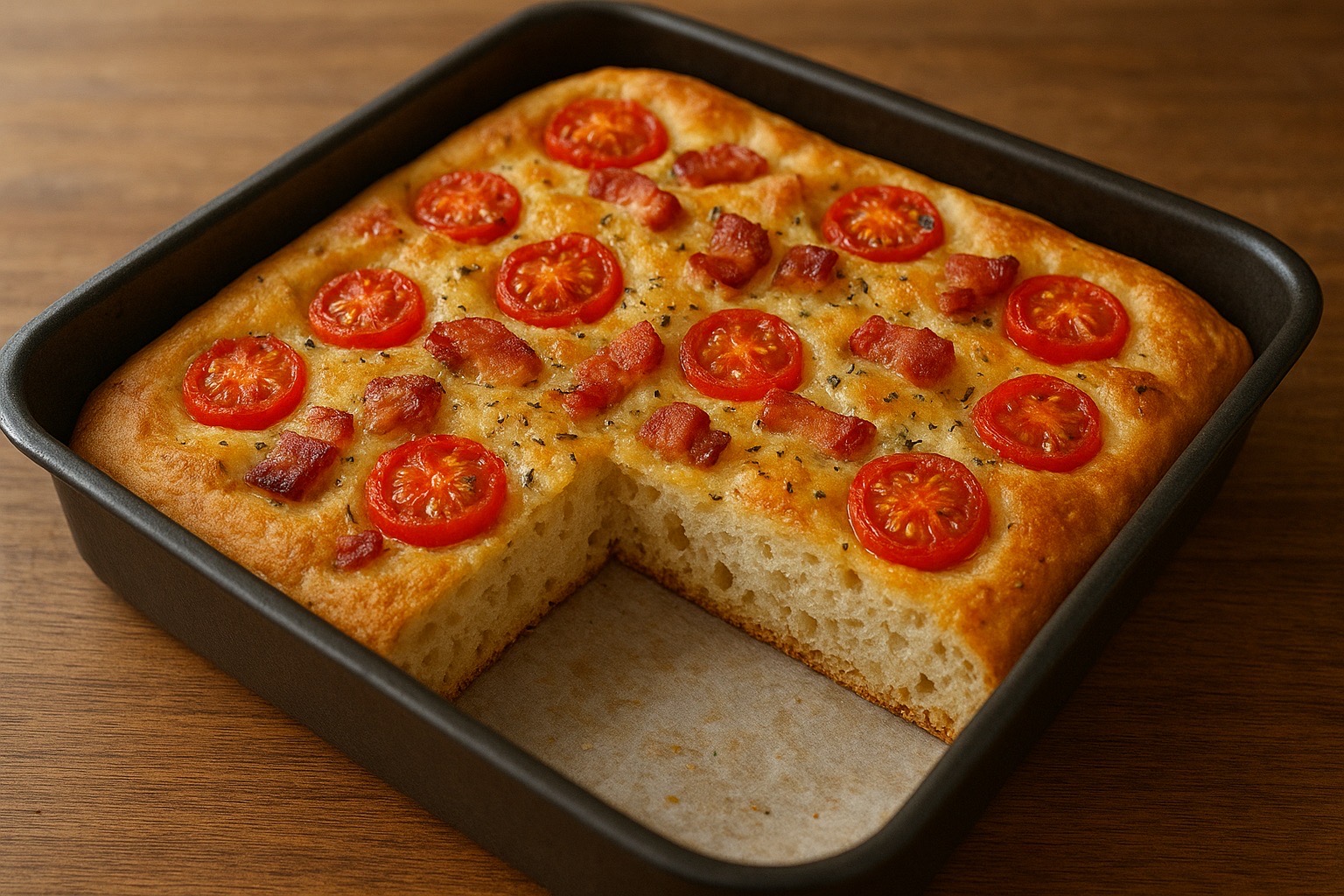 外はカリッ、中はしっとりもっちり。ベーコンの旨み、トマトの酸味、チーズのコクがじゅわっと広がる、食事にもおやつにもぴったりのフォカッチャです。高加水生地ならではのもっちり感を楽しめます。